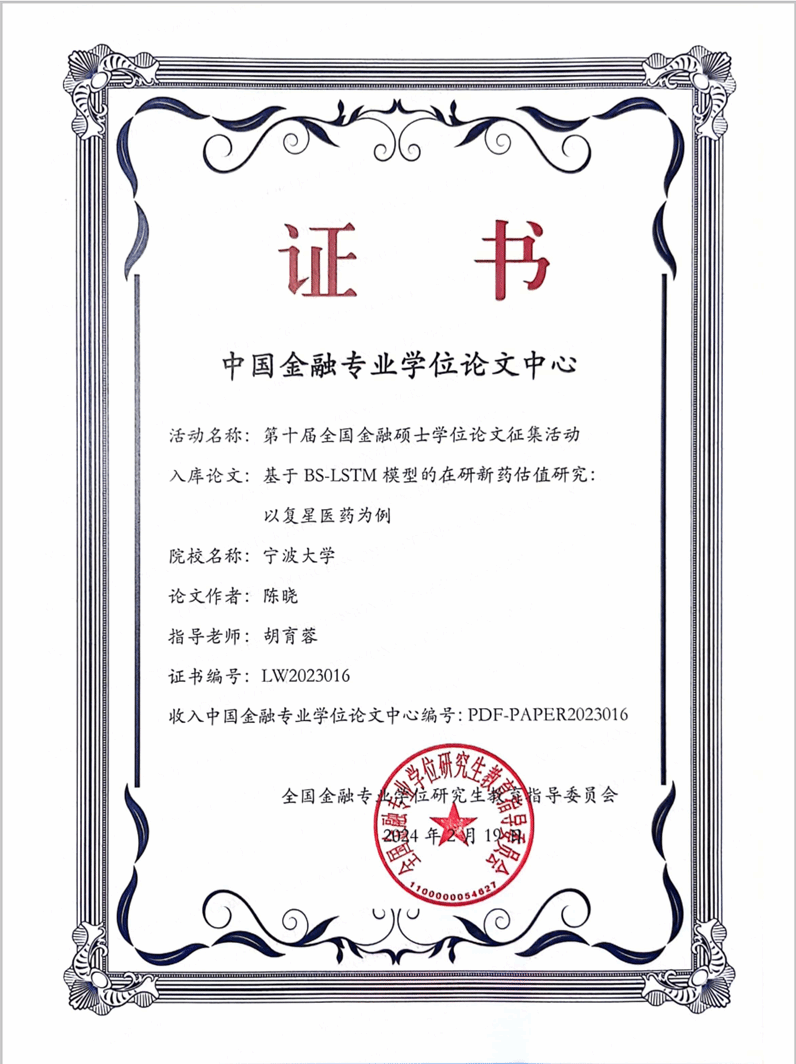 金融硕士陈晓的学位论文《基于BS-LSTM模型的在研新药估值研究:以复星医药为例》(指导老师:胡育蓉教授)入选中国金融专业学位论文中心(等同于全国优秀金融硕士学位论文)。捷克论坛
