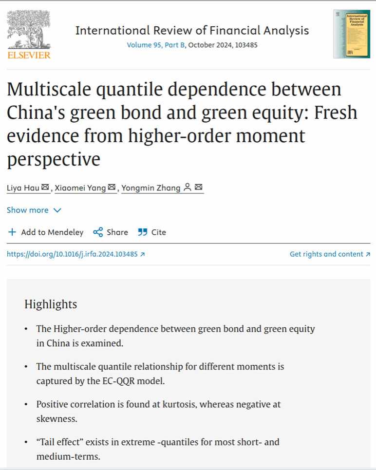 Liya Hau, Xiaomei Yang, Yongmin Zhang,(2024). Multiscale quantile dependence between China's green bond and green equity: Fresh evidence from higher-order moment perspective. International Review of Financial Analysis, 95, 103485.