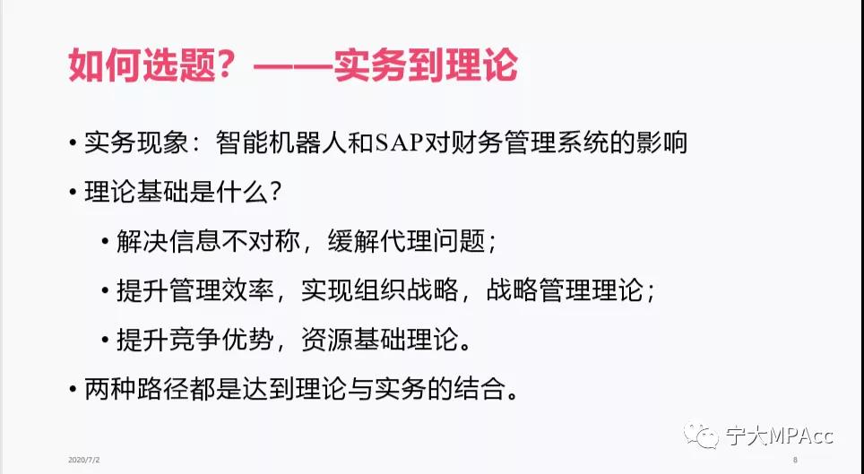 在如何选题这一方面,王悦老师向我们介绍了两类选题途径,分别是从理论到实务以及实务到理论,不论是哪种路径,最终的目标都是要达到理论与实务的结合。其次,王悦老师就论文选题的要点进行了详细讲述,她提到选题要尽量与自身的工作相符合,同时要关注已有论文选题的大致分布,尽量避免老生常谈的话题,但也要具有一定的理论基础,不可自行创造研究框架。