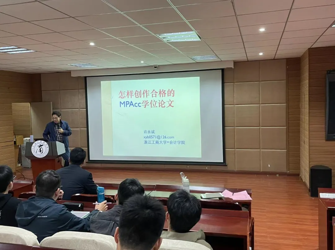 MPAcc教育中心于11号楼109阶梯教室召开了《怎样创作合格的MPAcc学位论文》指导讲座。本次讲座由浙江工商大学许永斌教授主讲。
