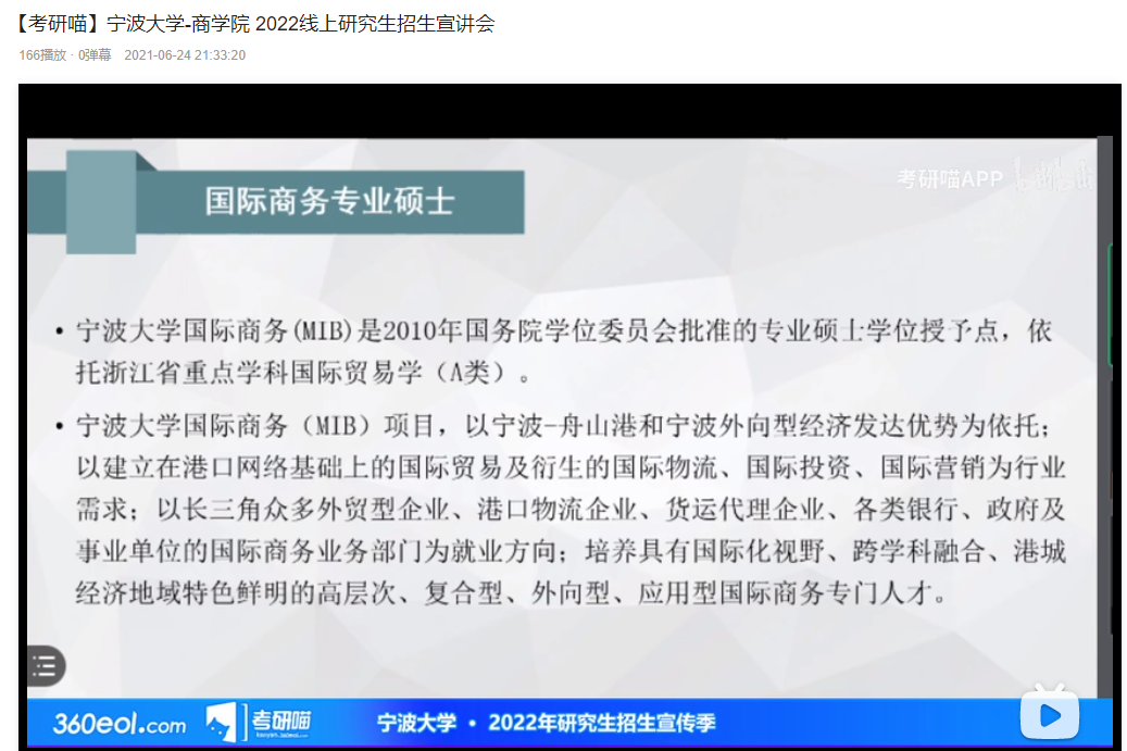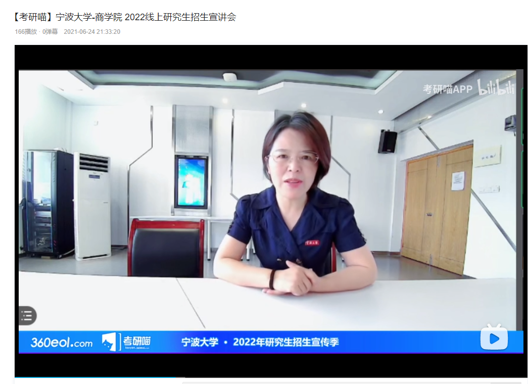 2021年6月23日,捷克论坛 2022线上研究生招生宣讲会在bilibili线上平台举行。国际商务专业硕士学位点负责人杨丽华讲授参加了线上宣讲会,介绍了我校MIB项目的培养目标、特色及专业建设情况。