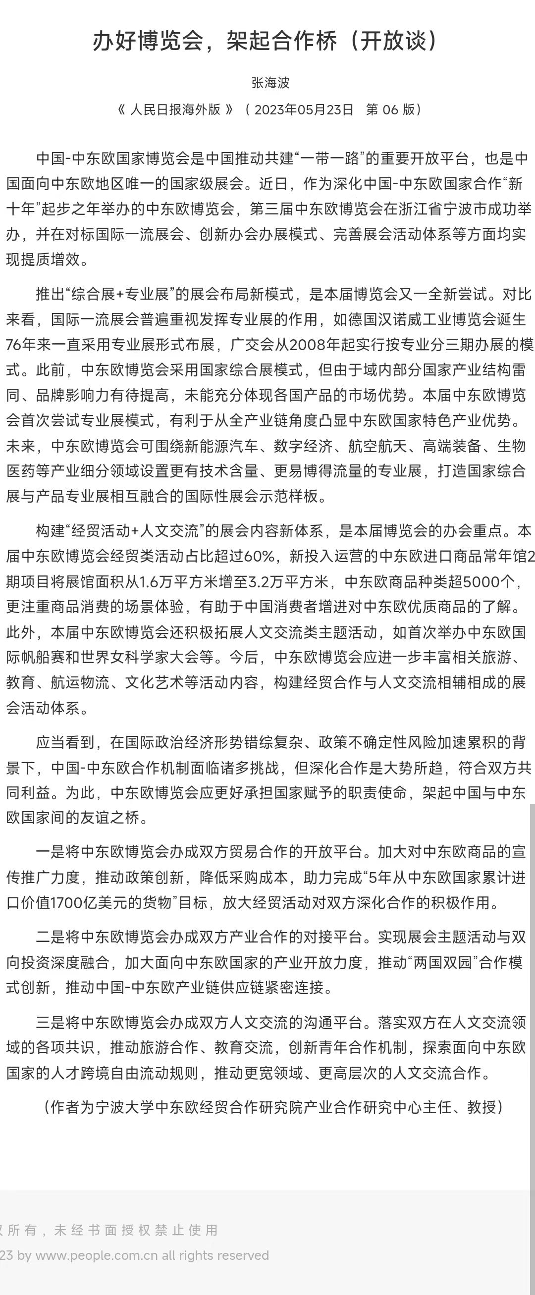 MIB学位点专任教师张海波教授在《人民日报海外版》发文谈如何办好中东欧国家博览会