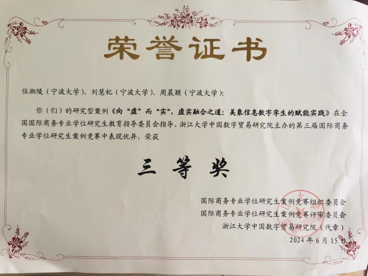 在此次案例评选活动中,我校MIB专职导师伍湘陵与研究生周晨颖(2023MIB)、刘慧妃(2023应用经济学)撰写的案例《向“实”而“虚”,实虚融合之道:宁波中集智能制造的数字化跃升》获评教学型案例三等奖,《向“虚”而“实”,虚实融合之道:美象信息数字孪生的赋能实践》获评研究型案例三等奖。
