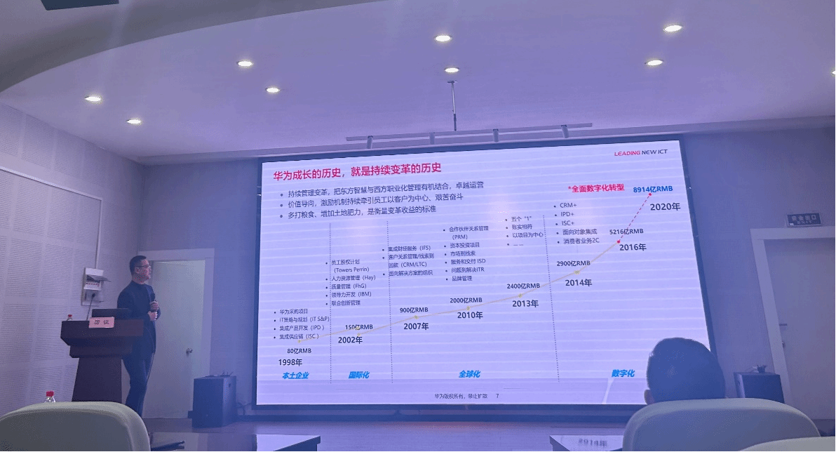随后,主题演讲环节成为了本次研讨会的核心亮点。华为大学高级合伙人、原华为企业 BG ICT规划与咨询部消费品与供应链领域总经理、华为公司数字化转型咨询首席专家厉征率先登场。他以丰富的实战经验和深刻的行业洞察,为大家带来了一场关于华为变革实践的精彩分享。通过一个个生动鲜活的案例,厉征专家将华为在数字化转型道路上的探索、创新与突破,淋漓尽致地展现在众人面前,让MIB研究生们深刻领悟到新质生产力在企业发展中的巨大推动力量以及在全球商业格局变革中的关键意义。