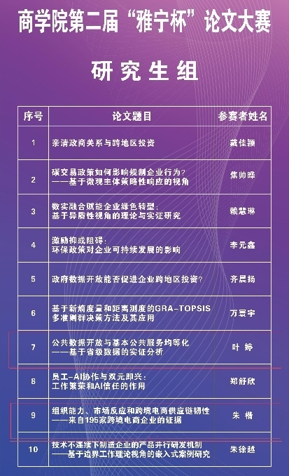 本次大赛的成功举办,展现了MIB学子扎实的学术功底与创新思维,更彰显了学院“以研促教、产教融合”的育人理念。参赛论文紧扣国家战略与行业前沿,体现了青年学子对社会经济的敏锐洞察与务实探索。第二届“雅宁杯”论文大赛圆满落幕,期待更多学子在学术征途上破浪前行,以智慧之光点亮创新未来。