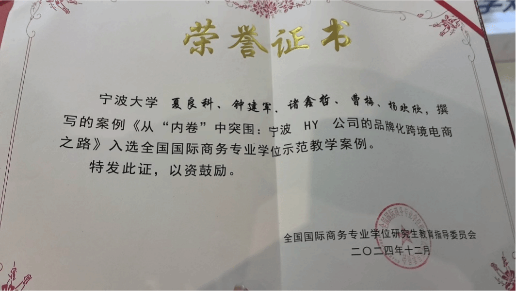 由我校国际商务专业硕士学位点教师夏良科、钟建军与2022级MIB研究生诸鑫哲、曹梅、杨欢欣共同撰写的案例《从“内卷”中突围:宁波HY公司的品牌化跨境电商之路》成功入选全国国际商务专业学位示范教学案例。该荣誉由全国国际商务专业学位研究生教育指导委员会颁发,彰显了捷克论坛 国际商务学位点在国际商务教育领域的卓越实力。