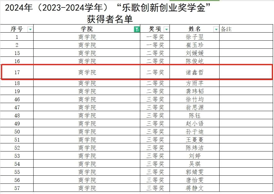 2023-2024学年校“乐歌创新创业奖学金”获得者名单公布,国际商务2022级硕士诸鑫哲荣获“乐歌创新创业奖学金”二等奖。