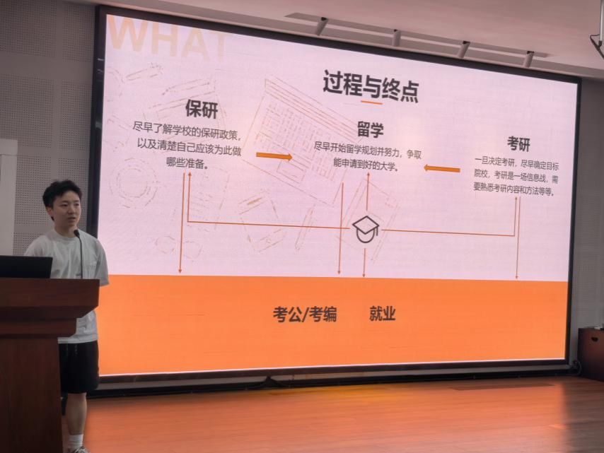 会议下半场,由本科生第五党支部副书记、22级经济学班长叶正昊主持。五位优秀毕业生代表张华英、姜妍、苏振杰、史怡和王欣妍,分别围绕保研、考研、留学及考公等不同路径,分享了各自的经验与心得。张华英分享了保研之路,强调实力与视野并重;姜妍分享了考研上岸的经验,强调效率与心态双驱动;王欣妍分享了跨考逆袭的经历,强调勇气与方法并存;苏振杰分享了留学启航的经验,强调规划与适应齐头并进;史怡分享了考公上岸的经验,强调目标与坚持缺一不可。他们的真诚分享为低年级学生提供了宝贵的参考,也展现了当代大学生多元发展的可能性。