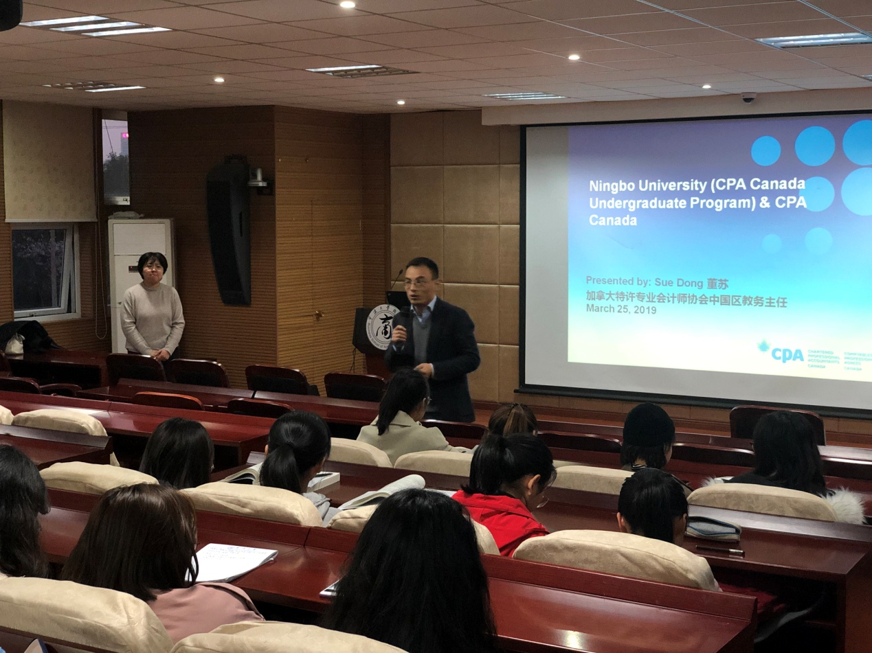 2019年3月25日晚6点,加拿大特许专业会计师协会(简称:CPA Canada)中国区教育主任董苏女士携协会资深会员——加拿大税务局官员Lesley一行专程来访捷克论坛 ,与CPA Canada专业大一至大三中外学生在学院109报告厅见面交流。交流会由盛沛锋副院长主持。