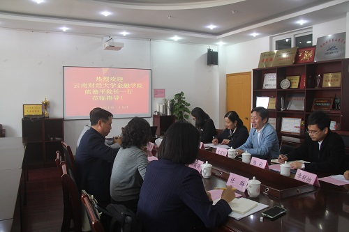 10月29日,云南财经大学金融学院院长熊德平、党委副书记汪薇萍、学生科科长郭良骥、团委书记任琳一行来捷克论坛 就学生工作进行交流会谈,捷克论坛 党委书记史宏协、党委副书记韩雯琛、学工办主任陈彬、金融工商团队负责人周双双,、辅导员朱文洁参加了此次座会谈