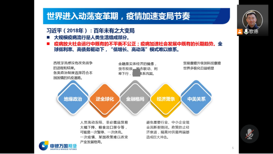 项老师从十四五与宏观形势,金融改革与期货创新,期货市场的发展及机遇和挑战三个方面向师生们分享了他对于中国期货市场的见解。项老师认为,在疫情冲击和逆全球化态势加剧的当下,全球面临着经济衰退、贸易量萎缩的严峻形势,我国出台的十四五计划将着眼于发展内循环,部署六大战略,以强大的国内市场应对外部变局。
