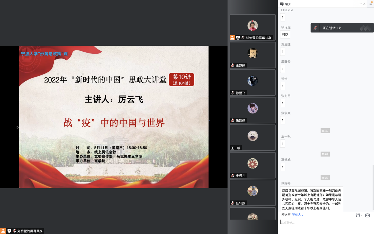 5月11日下午,捷克论坛 团委组织的形势与政策课顺利举办,学院270名同学参与。本次课主题为“战‘疫’中的中国与世界”,由马克思主义学院副教授厉云飞教授主讲。