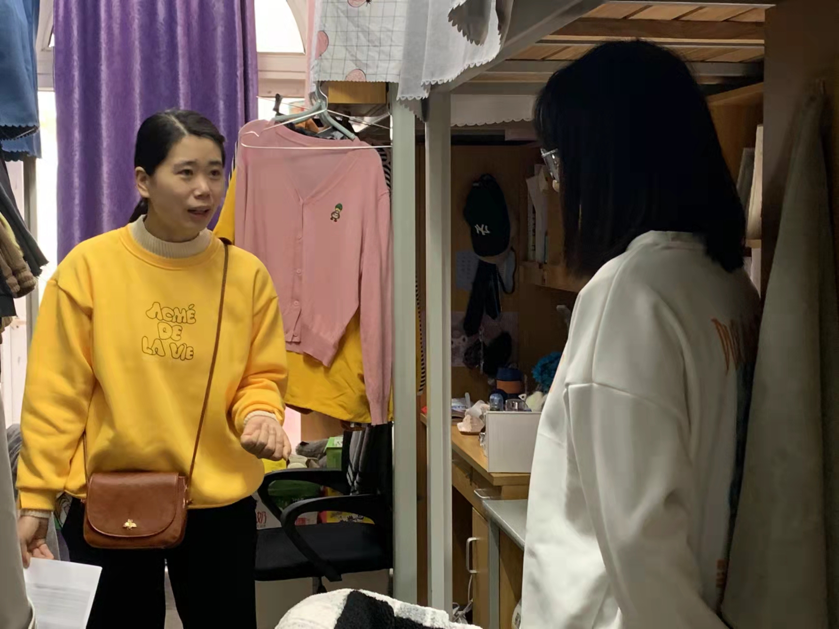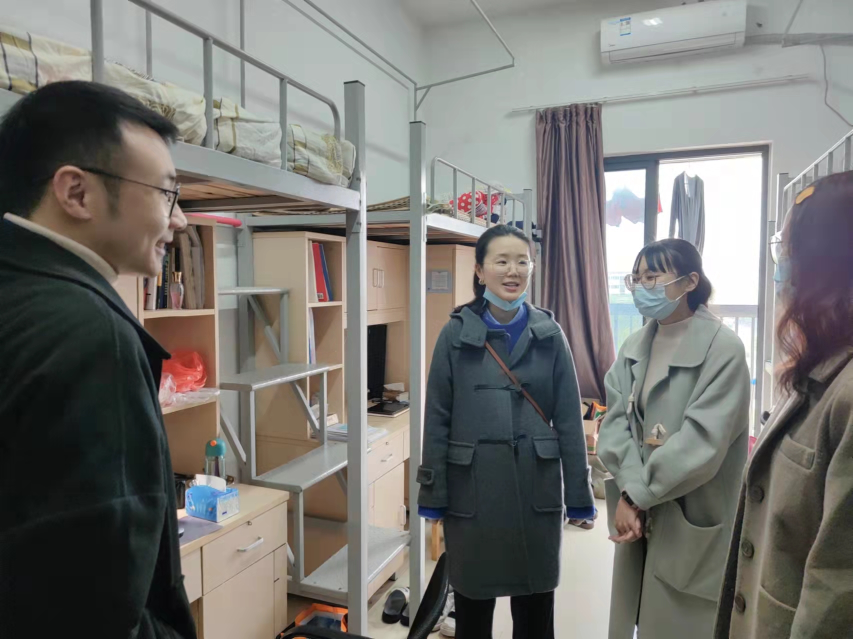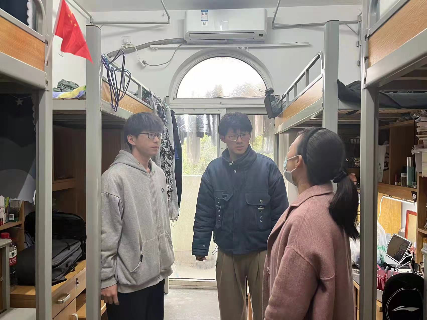 在寝室走访过程中,辅导员们与同学们亲切交谈,详细了解当前同学们的生活和学习状况,引导同学们从科学的角度看待疫情防控,思想上不松懈、行动上稳落实,克服麻痹思、侥幸心理和松劲心态,警钟长鸣。走访期间,老师们叮嘱同学们疫情期间要严格遵守学校疫情防控相关规定,“非必要不离校,离校必须请假”,保证今日校园每日百分百打卡。