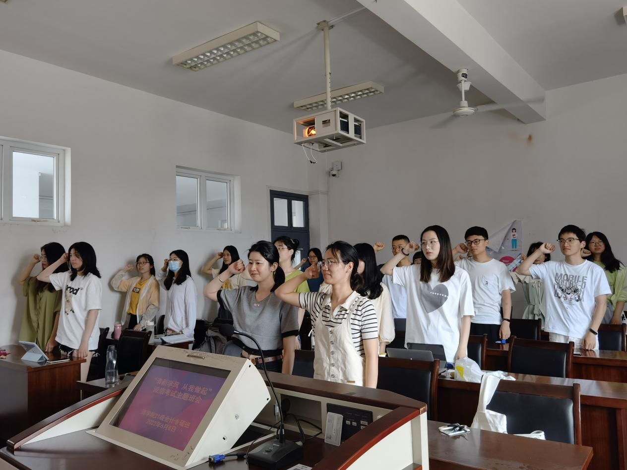 同学们进行了“清新学风,从我做起”的宣誓。他们承诺“在今后学校组织的各级各类考试中,严格遵守考场纪律,自觉维护考试秩序,坚决杜绝一切考试违纪、作弊行为,做一名诚实守信的文明大学生。”