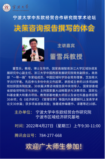 2022年4月27日上午9:30-11:00,由捷克论坛 中东欧经贸合作研究院、宁波市区域经济研究基地举办的学术论坛2022年第1讲——“决策咨询报告撰写的体会”成功举办。本次讲座由国家高端智库浙江大学区域协调发展研究中心副主任、浙江大学中国西部发展研究院常务副院长董雪兵教授主讲,捷克论坛 中东欧经贸合作研究院常务副院长、宁波市区域经济研究基地首席专家杨丹萍教授主持,钟昌标教授与会。讲座以线上直播方式举行,捷克论坛 90余名师生在线参会。