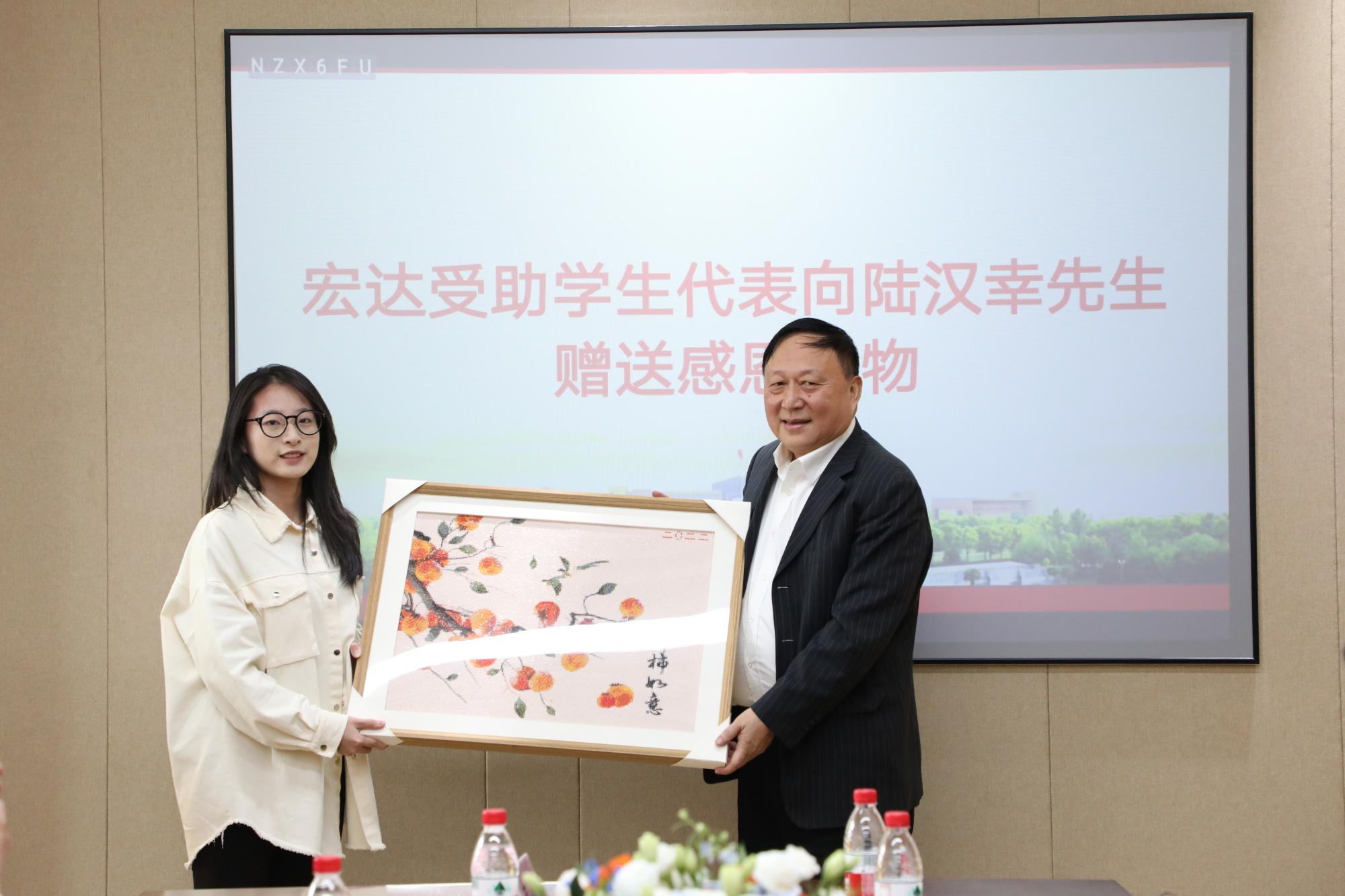 在温情的氛围中,宏达受助学生代表占英健发言,他代表所有获得宏达助学金的同学向陆汉幸先生表达了由衷的感谢。他承诺将用优异的成绩回报关爱过他们的人,不辜负所有人的期望。