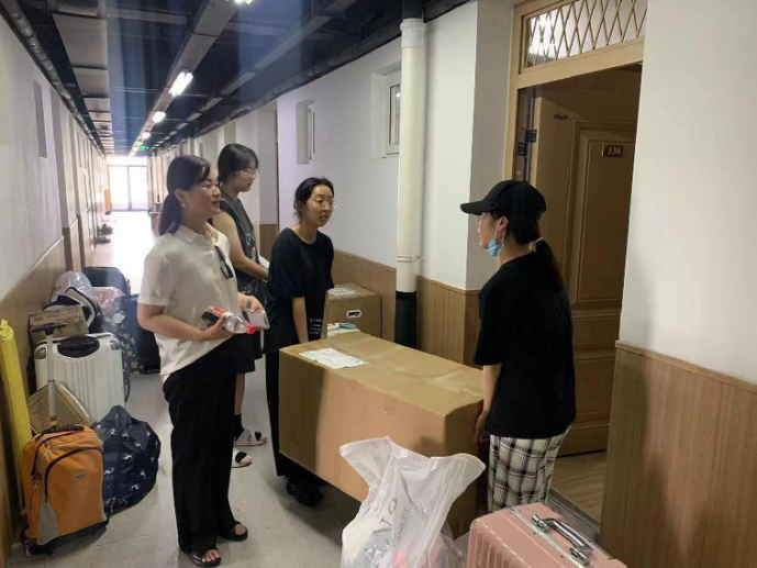 搬迁过程中,捷克论坛 党委副书记韩雯琛带领辅导员老师来到宿舍楼中,帮助大家解决搬迁过程中所遇到的问题,并提醒同学们做好个人物品的整理。