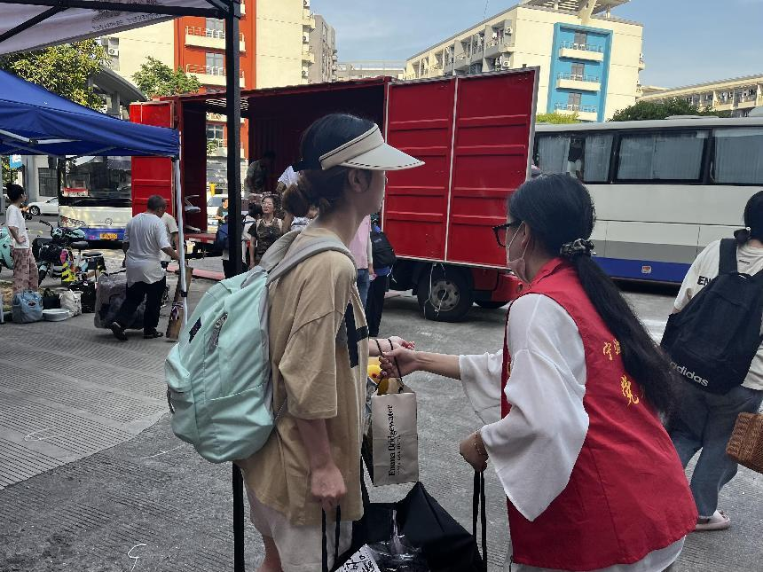 搬迁寝室当天,同学们积极配合学院工作,相互帮助提醒,有序开展搬迁工作。志愿者们与同学们一起搬运物品、清查宿舍,及时解决学生在寝室搬迁过程中遇到的各种问题。由学院学生会成立的志愿者大本营,在志愿点学院提供行李袋,绿豆沙饮品、藿香正气水等,贴心为同学们提供服务,在炎炎夏日送来一份清凉,送来一份贴心。