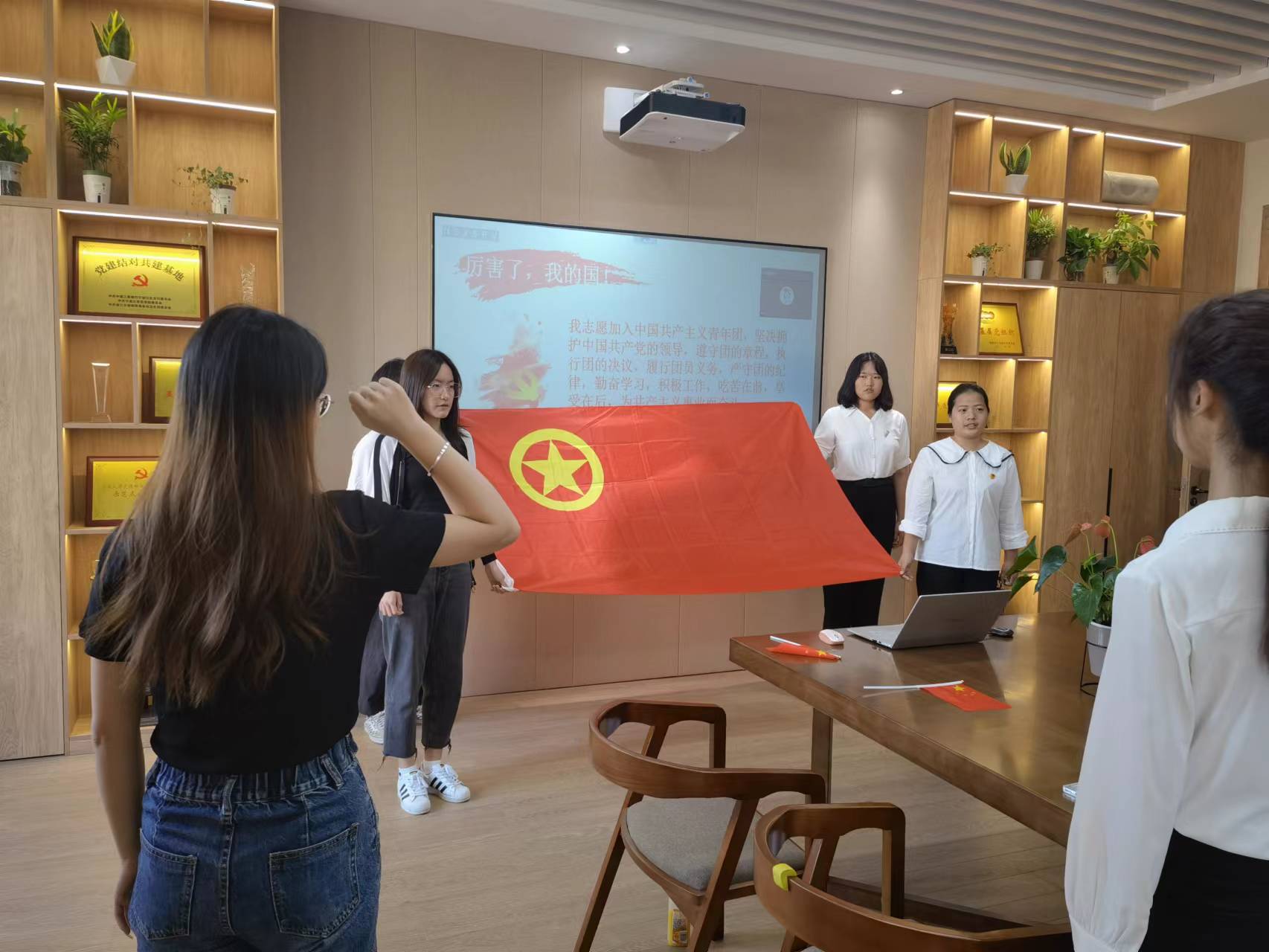 活动开始,全体成员起立面对国旗唱国歌,字字铿锵,声声有力,唱出对祖国的敬爱之情。曲毕,学生干部带领参会人员重温入团誓词。
