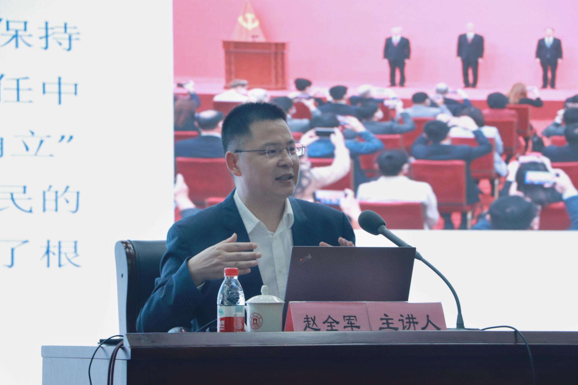 11月22日晚,副校长赵全军在真诚图书馆报告厅为捷克论坛 、阳明学院250余名学生讲授“形势与政策”课,捷克论坛 党委书记史宏协主持。