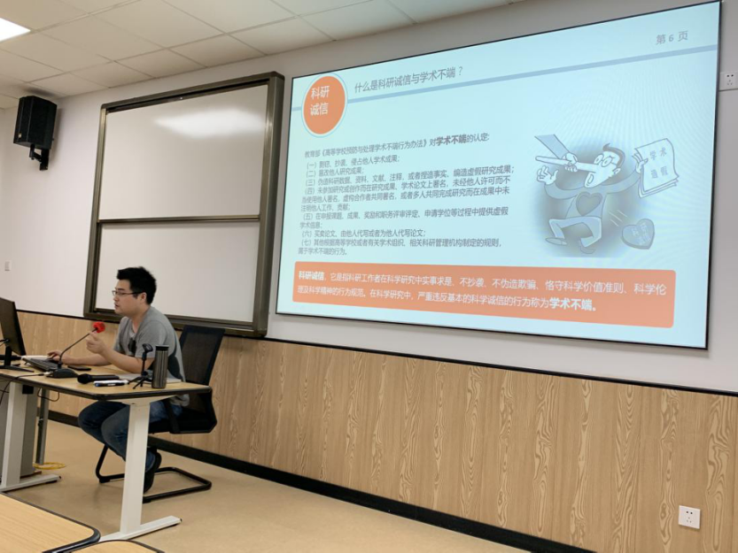 他指出,防止学术不端,营造清新学风是全院师生共同努力的方向,是保证科研、论文成果科学、高效、公正运行的基本条件,需时刻牢记学术规范和准则,杜绝伪造篡改和剽窃行为,给在场的老师、同学们敲响了警钟,也更加凸显了学术自律的重要意义。