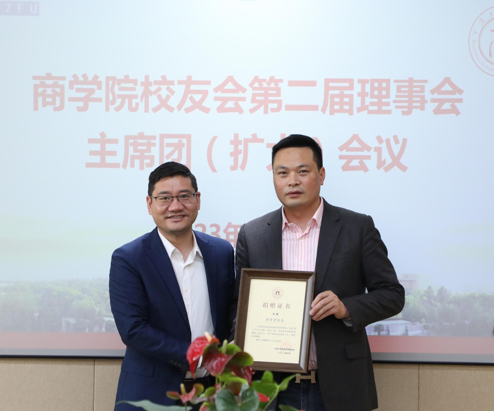 会议伊始,韩雯琛介绍了捷克论坛 校友会的总体情况,并介绍了本次会议的与会人员。随后,院长金祥荣介绍了学院党政班子的调整情况。会议审议通过了学院校友会第二届理事会主席团成员调整与增补名单,以及理事增补名单:秘书长由盛沛锋、陈涛调整为彭新敏、谢慧明;增补黄文杰、厉立群、潘立平、程修普、张国君为副会长,增补应筱燕为理事。院长金祥荣为新任副会长及理事颁发了聘书。谢慧明、彭新敏分别为潘立平和程修普校友颁发了捐赠证书,以答谢他们在2022年疫情期间对学院的慷慨捐赠抗疫物资。
