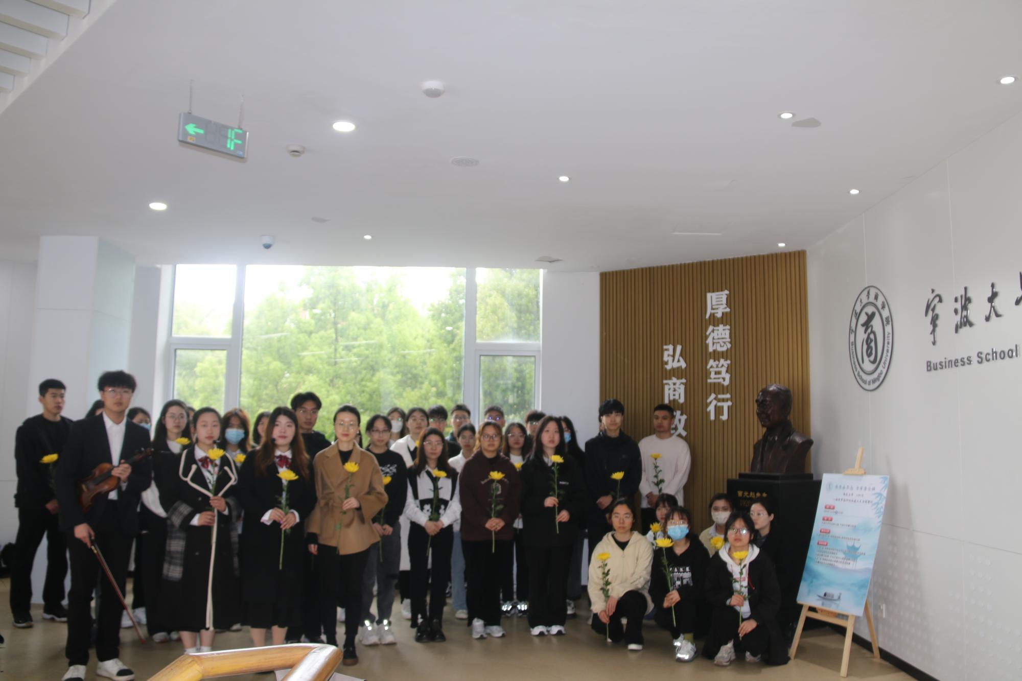 随后,一行人前往曹光彪楼,于大厅欣赏小提琴独奏《沉思》。一曲终了,文“话”商帮宣讲团分享了曹光彪先生的故事,“桃李不言,下自成蹊,斯人已逝,星火相传。感谢曹光彪先生为捷克论坛 做出的无私贡献,为我们提供更好的教育资源,我们要感谢曹光彪先生,牢记宁波帮人士的付出,学习弘扬宁波帮精神”。宣讲团成员胡馨尹的话语久久萦绕在同学们耳边。仪式现场,同学们有序地在曹光彪先生铜像前献上献花。