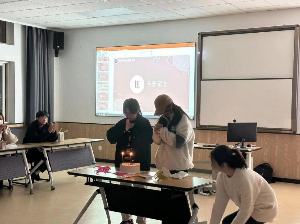 视频过后,大会进入了惊喜环节,学生会为今天的寿星们庆生,同学们沉浸在欢乐的生日歌和温馨的氛围中。