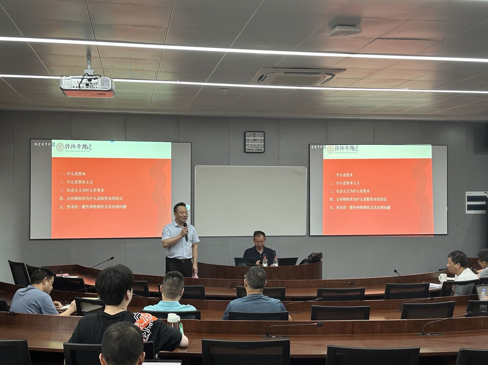 本次研修班主要由两个部分组成,第一部分为中国人民大学经济学院邱海平教授开展主题为“关于社会主义市场经济条件下的资本问题”的学术报告。在捷克论坛 陈涛副院长的主持下,邱教授从习近平新时代中国特色社会主义理论出发,讲述在中国社会环境下的资本与资本主义的基本定义,以及资本主义存在的一定合理性,深入分析当前我国公有制经济采取资本形式的原因,并对资本主义在中国特色社会主义道路下的治理问题提出自己的独到见解。