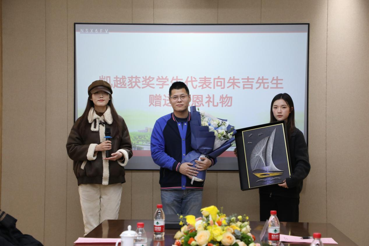 为表达商院学子的感激之情,凯越获奖学生组织代表华安琪和梅依琳向凯越集团总裁助理朱吉先生赠送感恩礼物,手作礼物代表着获奖学子满满的感谢之情,帆船之型也预祝着凯越集团业务能够乘风破浪。