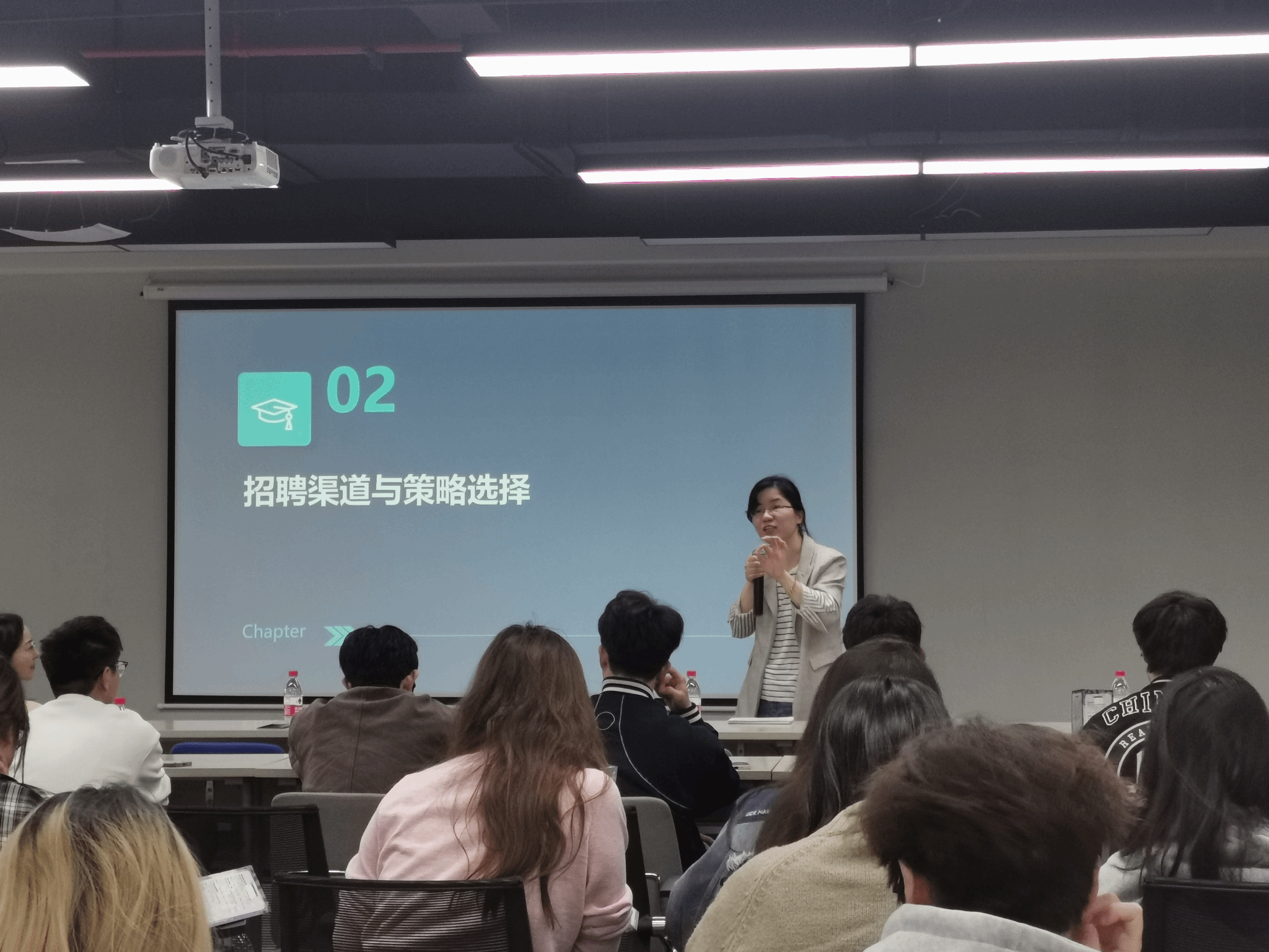 接着,遨森电商的母公司萌恒集团的人力资源部经理董女士为同学们举办了一场关于招聘实践的精彩讲座。她详细介绍了公司在人才招聘方面的策略,包括如何筛选合适的人才及有效的人才留存方法。此外,董经理还提供了多项实用的求职建议,涵盖撰写简历、面试技巧以及如何寻找理想工作等方面,旨在为同学们日后选择工作单位提供指导和参考。