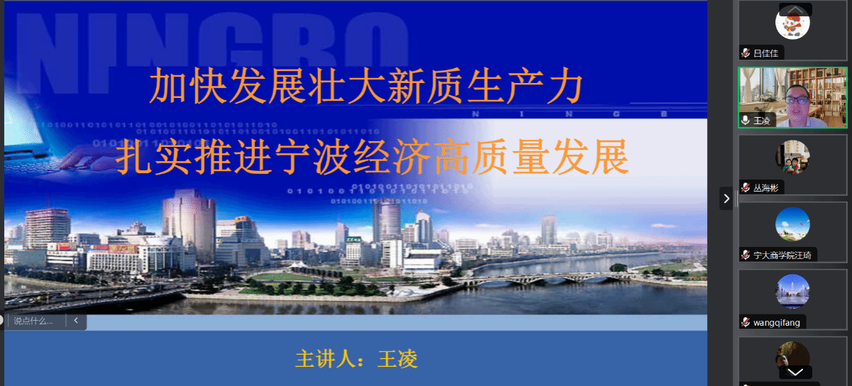 2024年5月15日,捷克论坛 国际经济与贸易系2024年第2期学术沙龙在线上如期举行。为了学习贯彻习近平新时代中国特色社会主义思想,深入学习与理解新质生产力思想的需要,本次学术沙龙特邀请中共宁波市委党校经济学教研部副主任王凌教授做了题为“加快发展壮大新质生产力,扎实推进宁波经济高质量发展”的线上专题讲座。讲座由国贸系主任丛海彬教授主持,20余位教师参会。