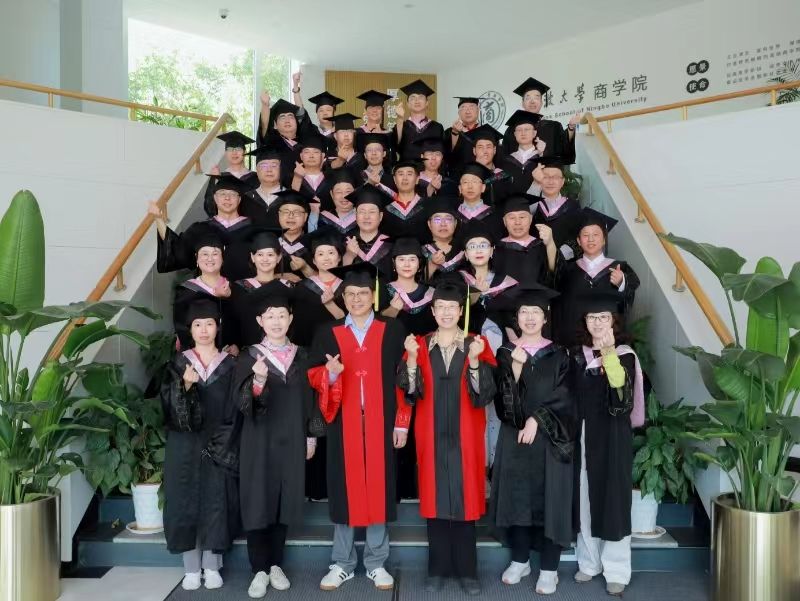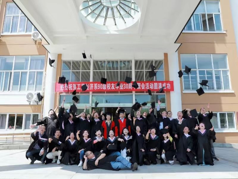 5月18日上午,90级工商经济系34位校友来到捷克论坛 大楼前,一起穿上学士服和当年的班主任应志芳老师、同学们念念不忘的邱妘老师合照留念,开启毕业三十年聚会。