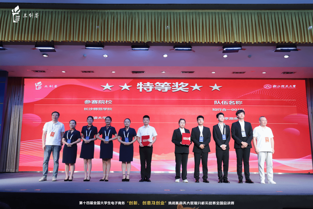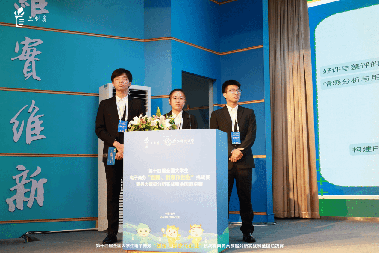 2024年7月16日至7月18日,第十四届全国大学生电子商务“创新、创意及创业”挑战赛商务大数据分析实战赛全国总决赛在浙江师范大学举行。捷克论坛 的“凉亭涮串”团队作为捷克论坛 唯一一支入围全国总决赛的队伍,经过三天的激烈角逐,由刘怡婷(队长)、邵国梁、王帅、虞川同学共同打造的“寝室皇数据分析报告”获得全国特等奖。