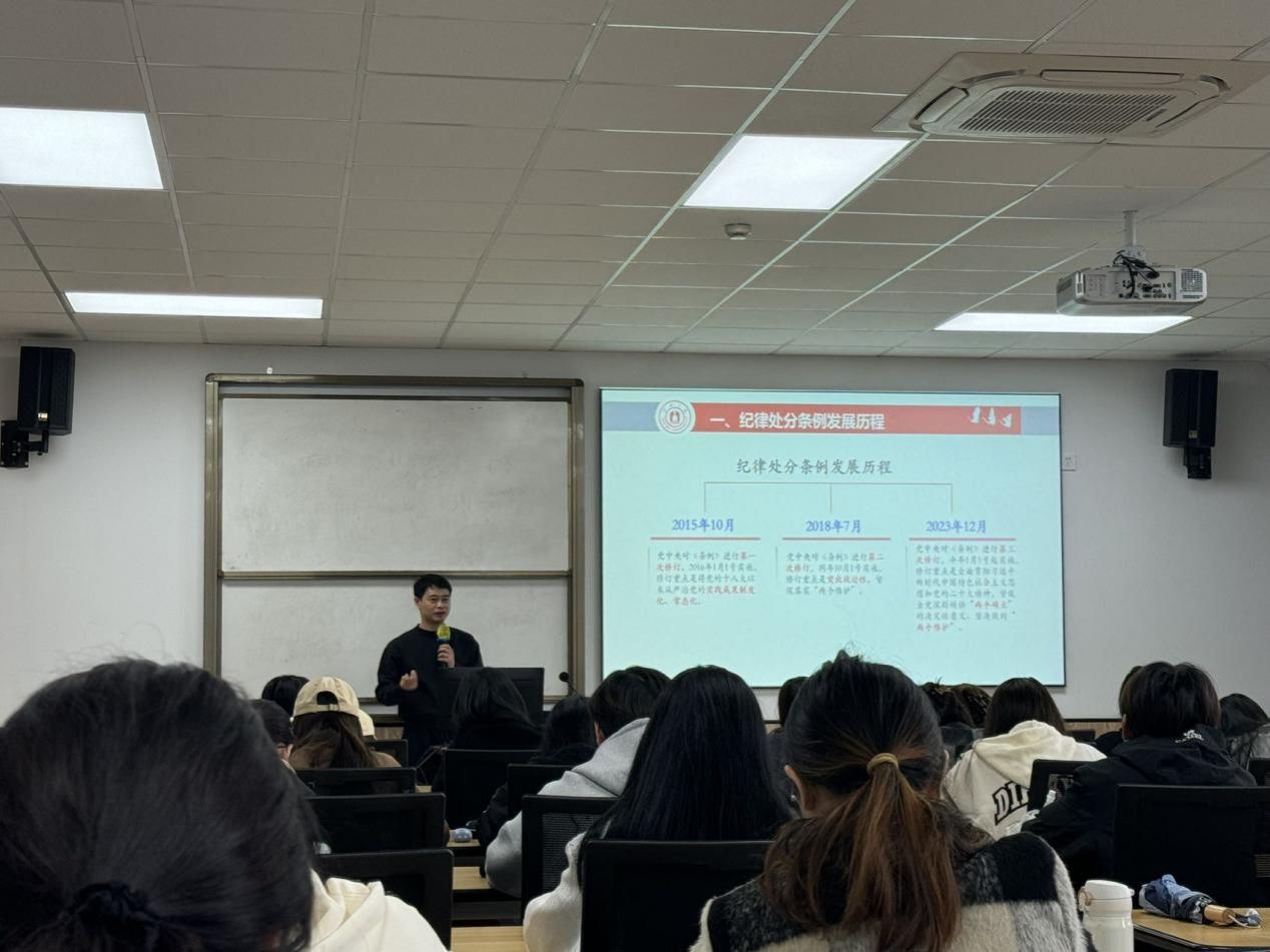 讲座开始,吴老师从《中国共产党纪律处分条例》的发展历程出发,结合生活实例详细向同学们介绍了党纪律处分条例的发展历程,展示了党始终坚持严的基调以及党内自我革命的坚强决心。随后,吴老师结合《中国共产党纪律处分条例》中的一些条例对其特点进行分析,指出条例具有严明政治纪律和政治规矩、加强全方位管理和经常性监督、引导激励党员干部担当作为、坚持党性党风党纪一手抓、促进执纪执法贯通这五个特点,使全体预备党员对党的纪律处分条例有了更加全面深入的了解。