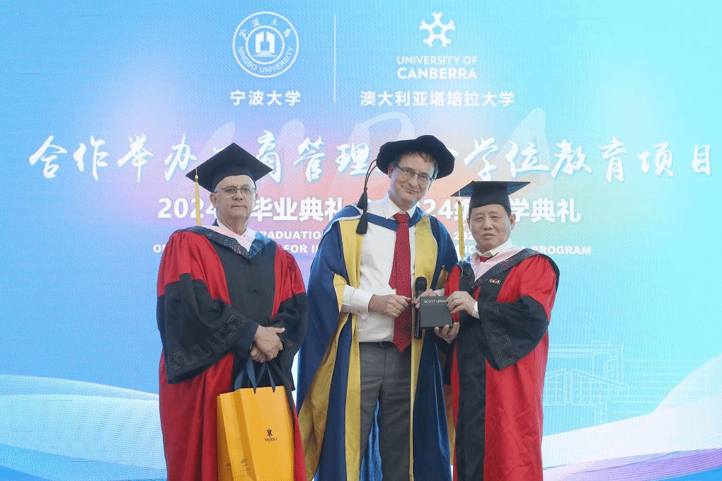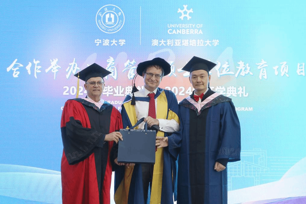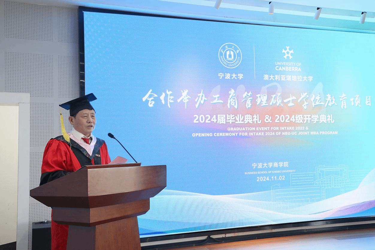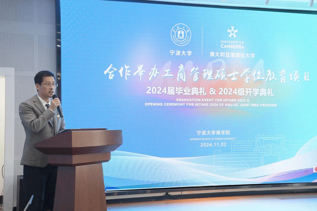 2024届毕业生余丹作为毕业生代表发言。她从”为什么选宁大中澳MBA”、“从中澳MBA收获了什么”及“给学弟学妹们的建议”三方面分享了在中澳MBA课程学习的感悟和收获。随后,毕业生代表向捷克论坛 和澳大利亚堪培拉大学商政法学院赠送了精心准备的富有中国文化特色的毕业礼物。澳大利亚堪培拉大学也分别向捷克论坛 和毕业班级回赠了具有堪培拉地标特点的礼物。