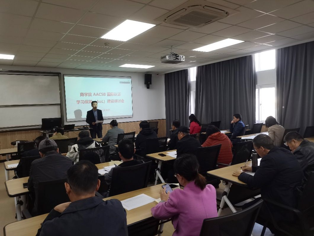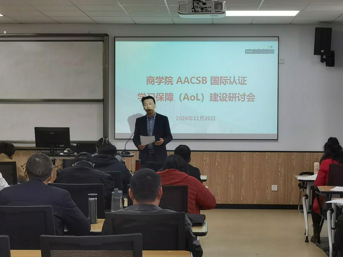 朱一鸿首先向与会老师通报了学院AoL建设概况,重点介绍了学院“AoL委员会—学位项目—课程组”三级组织机制及职责分工。随后,结合AACSB认证九大标准之一的AoL建设与课程测评流程,全面分析了每一个环节的重点任务及关键要求。他指出,AACSB认证是国际三大商科认证中周期最长、难度最大的一项认证,AoL又是AACSB认证中最复杂的一环,学院目前AoL建设涉及全院76门本科生、研究生核心课程,所有教师都参与其中。召开此次研讨会的目的在于进一步明确认证标准与要求,进一步统一思想,在已经完成的三轮AoL建设基础上,查摆存在的问题和隐患,研究讨论优化举措,进一步扎实推进学院AACSB认证工作。