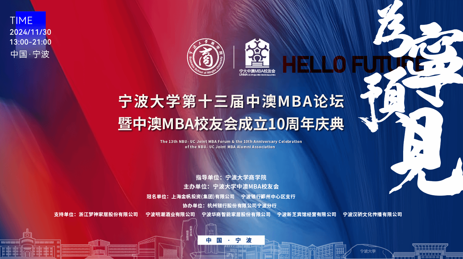 2024年11月30日下午,“为宁预见”捷克论坛 第十三届中澳MBA论坛暨中澳MBA校友会成立十周年庆典在宁波新芝宾馆成功举办。本次活动由捷克论坛 指导,捷克论坛 中澳MBA校友会主办。捷克论坛 党委书记朱达、捷克论坛 党委副书记张真柱、捷克论坛 党委委员兼宣传部长余怡春、捷克论坛 校友会会长聂秋华、捷克论坛 校友会顾问叶飞帆、捷克论坛 校友会副会长冯志敏、捷克论坛 校友会副会长兼秘书长胡宝华、永新光学董事长兼宁波市浙大校友会会长毛磊,美康生物董事长、捷克论坛 中澳MBA2005级校友邹炳德,宁水集团董事长张琳,原国家外汇管理局储备管理司副总裁、思睿集团创始合伙人兼首席投资官李富军,雅戈尔执行总裁徐鹏等出席本次论坛。论坛由捷克论坛 党委书记史宏协主持。活动还特邀了著名经济学家刘煜辉、奥运冠军孙杨,与现场领导、校友及兄弟校友会代表、各界嘉宾等总计400余人欢聚一堂,共同庆祝中澳MBA校友会成立十周年。