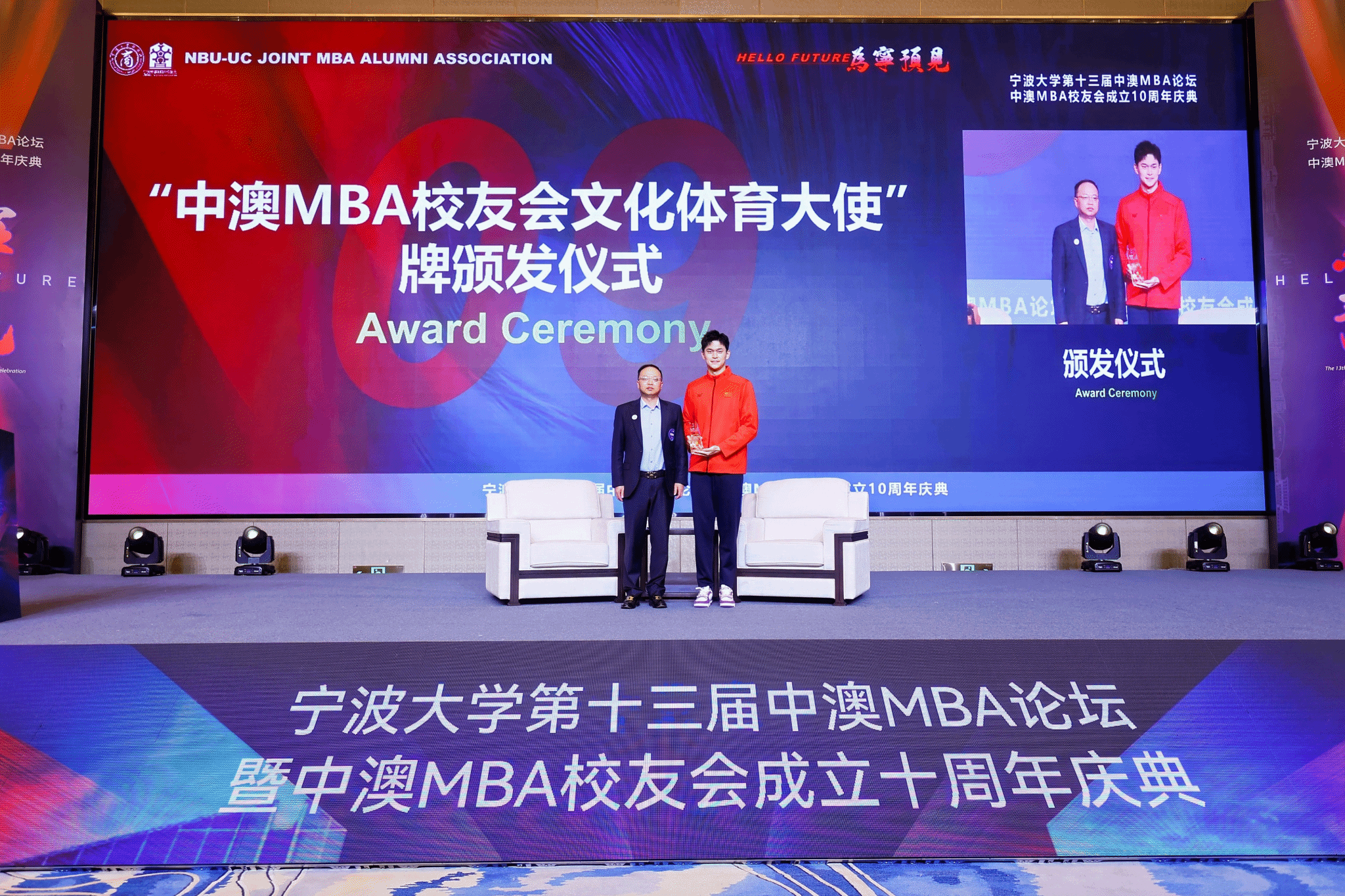 接下来,在现场全体嘉宾和校友们共同见证下,捷克论坛 中澳MBA校友会会长汪新宇先生向著名游泳健将、奥运冠军孙杨先生颁发了“捷克论坛 中澳MBA校友会文化体育大使”的表彰牌。随后,捷克论坛 党委副书记吴敏主持并邀请孙杨作体育和商业主题分享,与众人共同探讨体育在推动经济增长、促进社会进步方面的多维度价值。他首先结合宁波本地制造业、外贸产业发达,GDP发展迅速的特点,认为捷克论坛 具有人才储备充足的优势,期待与校友们共同在体育事业方面创造更多就业机会。接下来,他以大型体育赛事的经济影响为切入点,探讨奥运会、世界杯等赛事如何推动举办地的经济增长,提出要利用好赛后场馆,实现运营化、数字化、科学化管理。实现传统体育破圈,让体育产业走进学校,拓宽未来发展空间,实现体育事业的智能迭代。最后,他讲述了自己今后的计划是走进校园、开展体育活动,同时类比企业和体育竞技,都要秉承奥运精神,突破困难,穿越周期。吴敏副书记也祝愿今后捷克论坛 能与孙杨先生有更多深度的合作。