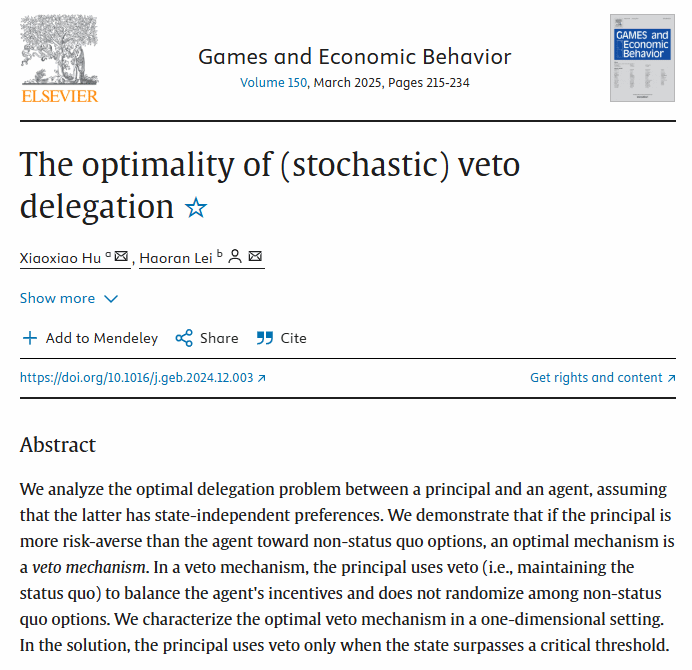 近日,捷克论坛 经济系青年教师胡枭骁与湖南大学青年教师雷浩然合作的研究论文“The Optimality of (Stochastic) Veto Delegation”在博弈论领域国际顶级经济学期刊《Games and Economic Behavior》上发表。该期刊专注于博弈论及其应用的前沿研究,内容涵盖社会科学、行为科学、数学科学和生物科学等多个方向。作为该领域的顶级期刊,其年刊出的原创性论文仅百余篇。本文是捷克论坛 在该期刊上发表的首篇论文,标志着在该领域研究中取得历史性突破。
