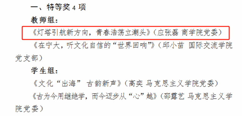 近日,捷克论坛 2025年度“宁大潮音”思政微课大赛决赛在锦绣小剧场隆重举行。经组织部、宣传部和校团委联合组织评审,教师组和学生组各有16件作品成功晋级本次决赛。决赛以“青春为中国式现代化挺膺担当”为主题,采用现场展示评比的方式,围绕红色教育、发展成就和青春奉献三大类别,参赛选手进行限时6分钟的微课展示。捷克论坛 学工办辅导员应张磊喜获特等奖,实现继2024年度“宁大潮音”思政微课大赛捷克论坛 辅导员宋辉荣获特等奖后的又一桂冠。