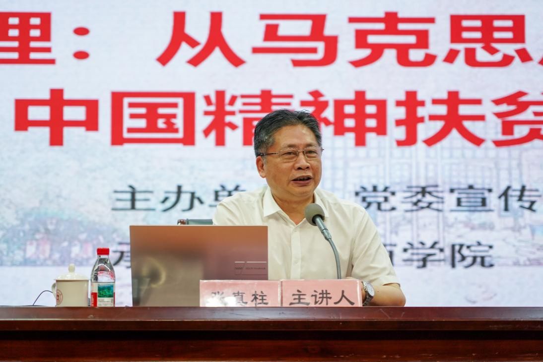 校党委副书记张真柱以“贫困治理:从马克思反贫困理论到中国精神扶贫实践”为授课主题,重点讲述以习近平同志为核心的党中央坚持以人民为中心,在脱贫攻坚战取得全面胜利等方面作出的卓越贡献。他结合当前具体数据和案例进行生动阐述,从“建国以来中国共产党贫困治理思想的演进”、“精神贫困及中国共产党人的治理实践”和“新时代中国特色社会主义精神扶贫基本任务、挑战及路径”三个方面向师生进行系统阐述。他指出,当前我国精神扶贫工作仍面临着诸多亟待破解的难题与严峻挑战。他认为,广大师生肩负着立德树人、传播文明的重要使命,既是精神财富的传承者与创造者,更是精神扶贫工作的重要参与者和推动者。他强调,每一位师生都应立足自身岗位和所学所长,尽己所能,有所作为;要时刻保持头脑的高度清醒和行动的无比坚定,要以更加求真务实的作风和更加坚如磐石的信念,持续不断推动精神扶贫工作取得新进展、新突破、新成效。