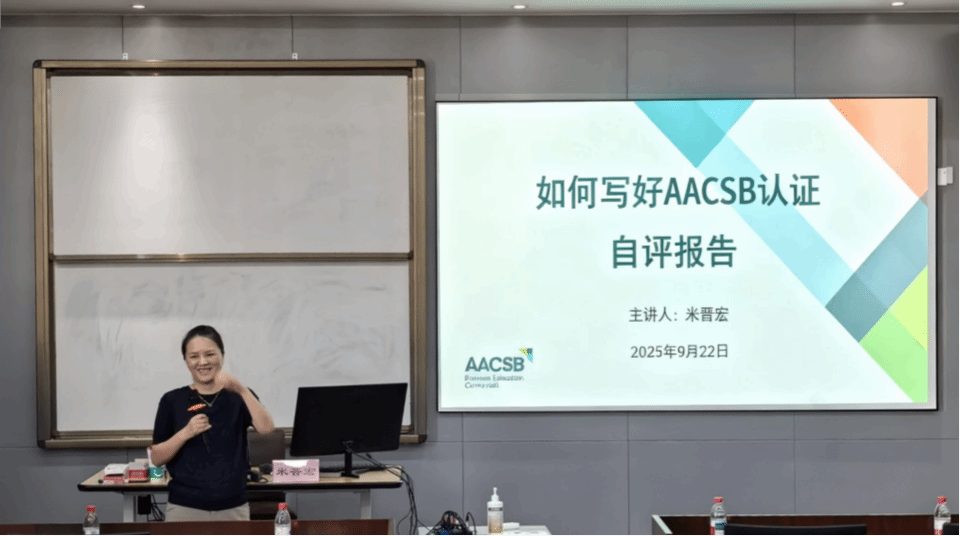 培训中,米晋宏教授聚焦AACSB认证中SER撰写的官方指导原则,进行了系统化地逐条讲解。他从“战略管理与创新”、“学习者的成功”到“思想领导力、参与和社会影响力”等三大部分九条标准入手,深抓要点和精髓,详细阐释了每条标准的内涵、证据要求与撰写要领。米教授强调,SER报告必须清晰展现学院在使命引领下,如何通过系统的流程和体系保障教学质量、促进师资发展并产生积极的社会影响力。