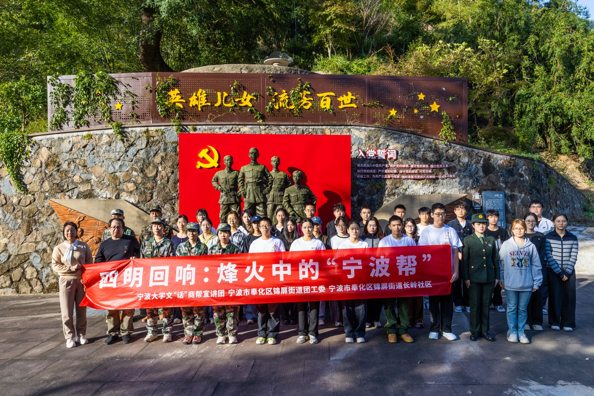 在宣誓广场中央,来自奉化区锦屏街道团工委的青年干部与捷克论坛 研究生同台切磋,围绕烽火中的“宁波帮”精神,将宁波籍海内外人士支援家乡抗战的故事“掰开揉碎”巧妙融入校地共话式教学设计中,进一步丰富了“三全育人”思政品牌内涵。