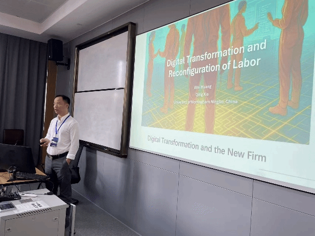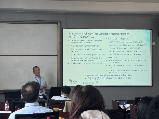 下午由捷克论坛 郝立亚副教授主持大会报告。两位特邀嘉宾分别进行了精彩的主旨演讲。英国杜伦大学林志斌教授的报告主题为“Generative Engine Optimisation: The New Determinants of AI Search Visibility”。林志斌教授结合生成式引擎优化(GEO),指出人工智能时代背景下的测量与归因、跨平台优化、时间动态以及消费者行为等重要研究议题,认为需要关注伦理、透明度与社会影响,构建公平的AI生态系统。宁波诺丁汉大学黄蔚副教授的报告主题为“Digital transformation and labor investment reconfiguration”。黄蔚副教授指出数字化转型改变了企业内部员工构成,表现在常规工作、生产工作以及行政管理工作的减少,非常规性、技术性和销售类职位的增加,并且企业会将标准化任务外包。