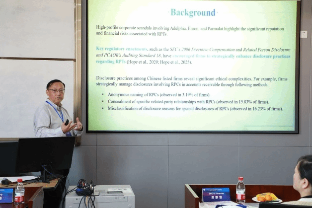 开幕式后,上午由捷克论坛 刘起贵教授和唐京华副教授主持大会报告。三位特邀嘉宾分别做了各具特色的主旨演讲。中南财经政法大学的石劲教授,国家重大人才工程讲席学者,进行了题为“Trade Credit Provisions for Related-Party Customers”的主旨演讲。石劲教授分析了企业向关系型客户和非关系型客户提供的贸易信贷差异,指出与关系型客户的互动显著加大了合规压力、财务风险和声誉方面的顾虑,致使企业缩减贸易信贷,以此作为符合监管要求和降低潜在声誉损害的策略。澳门城市大学金融学院院长,Wai Kong (Adrian) Cheung教授的演讲题目为“AIs and corporate governance-a risk management perspective”。Wai Kong (Adrian) Cheung教授指出人工智能与公司治理之间存在着一种动态的双向关系:一方面,人工智能改变了治理的实践方式。它增强了监督力度,减少了信息不对称现象,并引入了新的道德和监管责任;另一方面,公司治理框架则塑造了人工智能的开发和部署方式,从而确保其得到符合道德、透明且负责任的使用。英国卡迪夫大学Kent Matthews教授发表了以“FinTech and Relationship Banking: Partners or Rivals”为题的精彩演讲。Kent Matthews指出金融科技平台和数字银行平台共同占据了小额贷款市场。银行对每位申请人的贷款额度会比金融科技平台更高。关系经理对于在庞大的贷款市场中建立稳定性和平衡性是至关重要的。人工智能无法在所有方面都取代关系经理的角色。