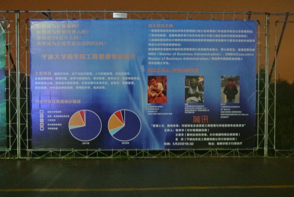 据悉,工商管理系从5月初就启动了分流宣传活动,市场营销和工商管理专业的多名在校学生主动请缨,协助相关老师深入班级介绍本专业的相关信息,发放宣传单,并在甬江公寓、餐厅周边借助于喷绘、横幅进行分流宣传。工商管理系还将通过学院开放日、现场咨询会等形式进一步开展分流宣传活动,以便更多阳明学生了解工商管理系和各相关专业。