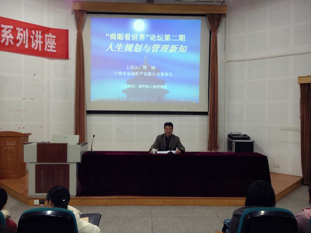 12月2日晚6:30-8:30,“商眼看世界”论坛第2期在龙赛理科楼报告厅成功举行。本次论坛邀请到的主讲人是宁波非金属矿产有限公司董事长、浙江省首届十大杰出青年周晗先生,来自阳明学院和捷克论坛 的师生近二百人参加本次论坛。