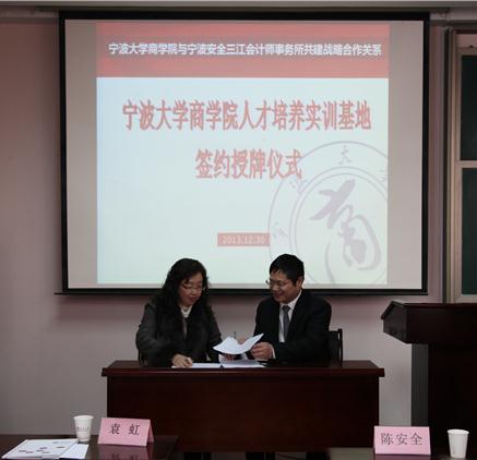 2013年12月30日下午2点,包玉书11号楼418室举行了捷克论坛 和宁波安全三江会计师事务所共建人才培养实训基地的签约暨授牌仪式。安全三江会计事务所董事长陈安全、副总经理蒋朝晖、行政人事经理周静、人力资源与管理咨询部经理胡晓萍、捷克论坛 党委书记袁虹、会计系主任郭强华及会计系教师代表出席了本次仪式。会计协会成员和三十多位会计系同学共同见证了此仪式。