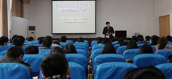 12月27日上午,亚洲开发银行首席经济学家,联合国发展经济学研究院中国项目部主任万广华教授做客捷克论坛 学术讲坛,为捷克论坛 近100名师生做了一场题为“Urbanization and trade in developing asia”的学术报告。捷克论坛 执行院长熊德平教授主持了本次讲座,副院长杨丹萍教授进行了精彩点评。
